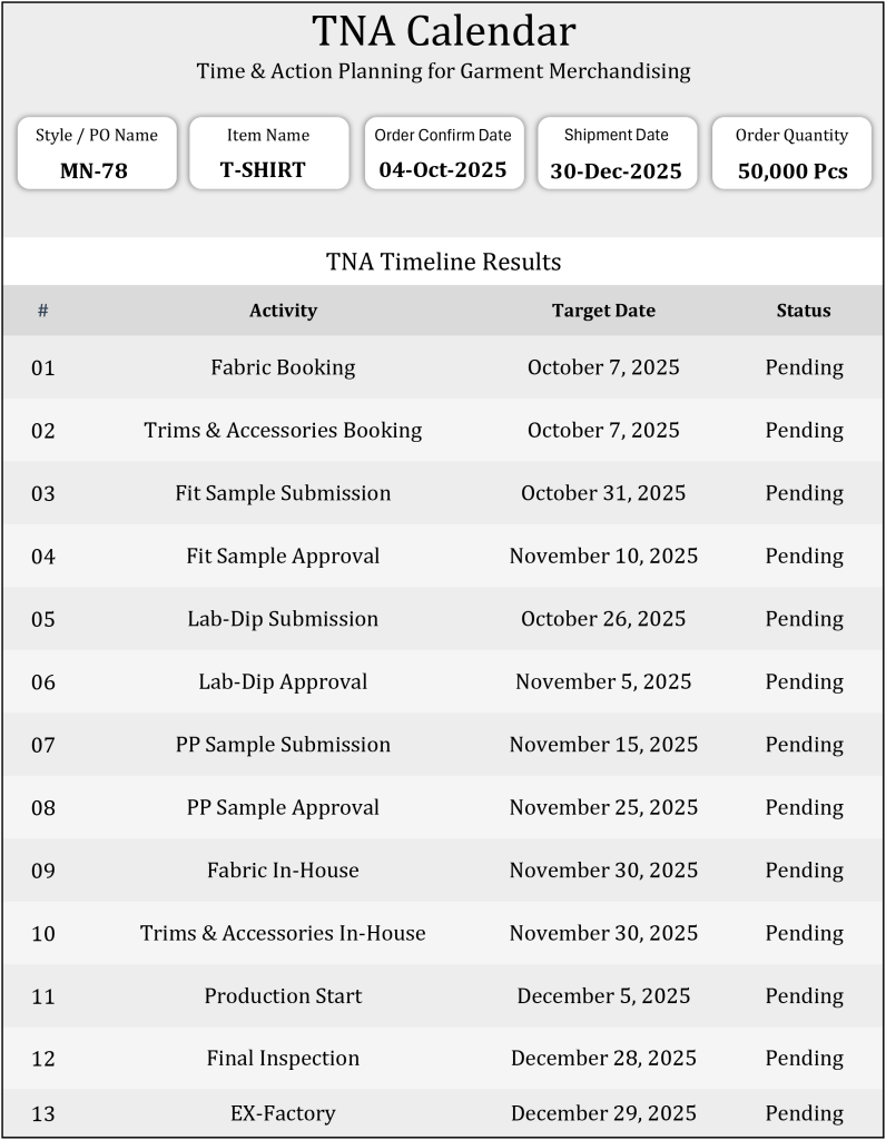From fabric booking, lab dips, sample approvals, production planning, to shipment — everything is listed in the TNA. It clearly shows what needs to be done, who is responsible, and by when.